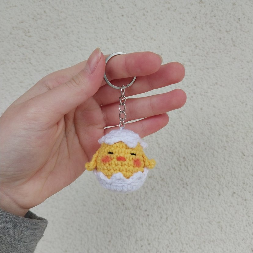 Renkli örgü malzemeden yapılmış, beyaz yumurta kabuğu içinde sarı civciv figürlü, bohem tarzda anahtarlık.