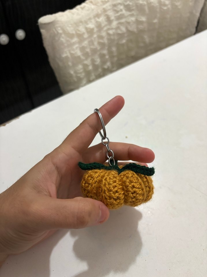 Örgü sarı kabak şeklinde, yeşil detaylı anahtarlık. Sade ve bohem tarzda, sıcak bir görünüm sunar.