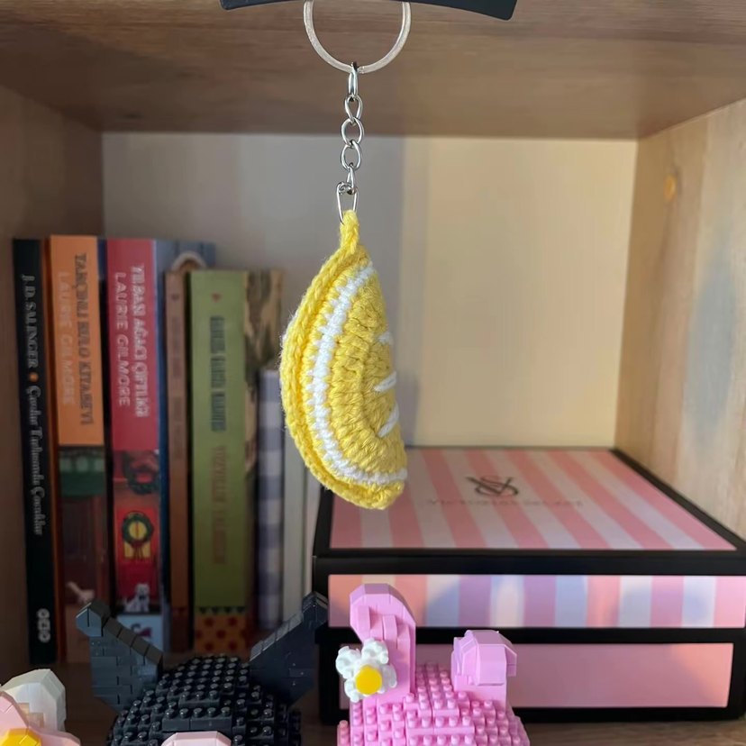 Örgü sarı anahtarlık, bohem tarzda, canlı renklerle ve minimal tasarımla. Retro ve hippie tarzlar için uygun.