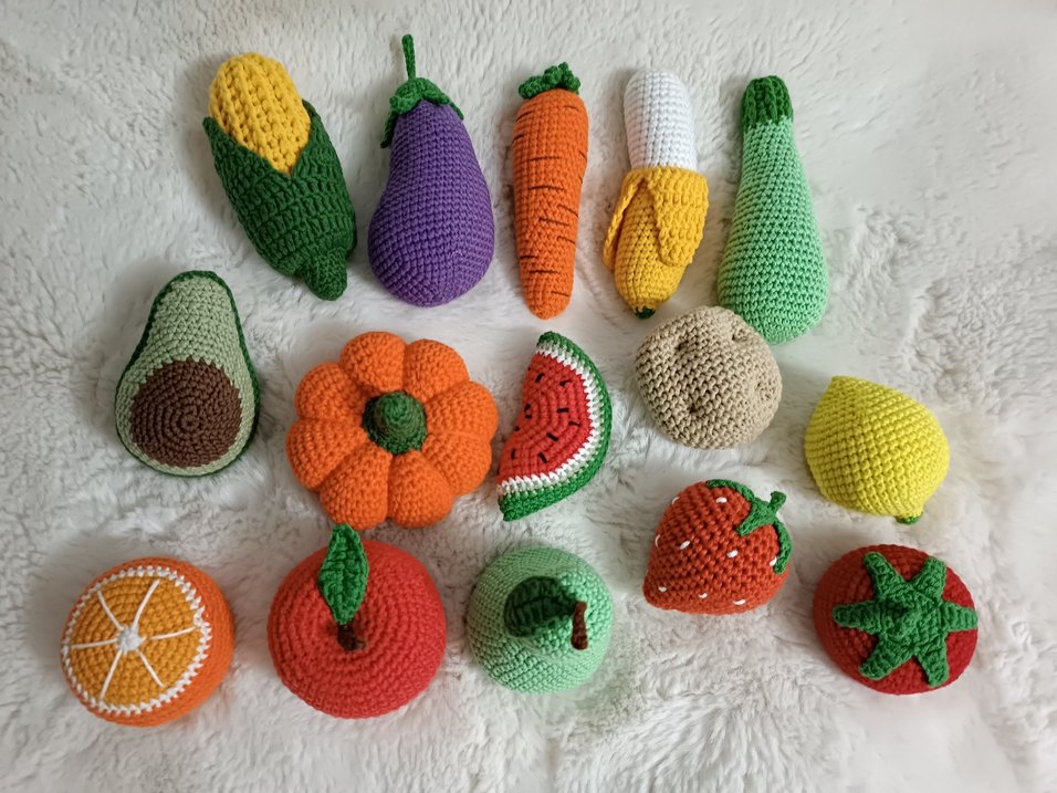 adet fiyatı, Renkli ipliklerle örülmüş mısır, patlıcan, havuç gibi sebze ve meyve figürleri. Dekorasyon veya oyun için uygundur.