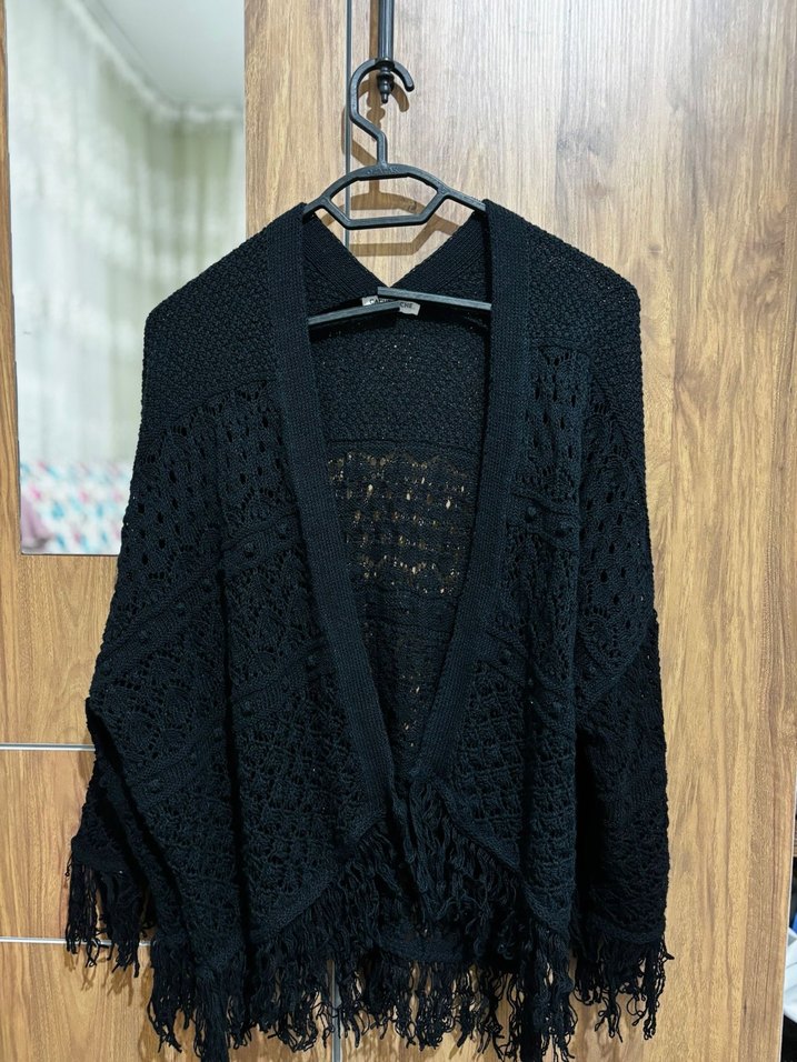 Örgü desenli, salaş kesim siyah hırka, uzun kollu ve yakasında notlu rever bulunur. Püskül detaylarıyla bohem ve rahat bir tarza sahiptir.