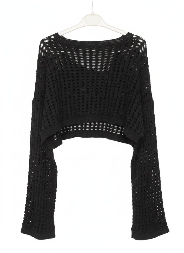 Siyah örgü kadın kazak, bol kesim, uzun kollu ve yuvarlak yakalıdır. Açık örgü deseni gotik ve avangart bir hava katar, rahat ve şık bir görünüm sağlar.