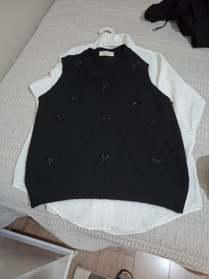 Kolsuz, örgü siyah süveter, salaş kesim ve yuvarlak yaka ile. Üzerinde küçük örgü fiyonk detayları bulunur, günlük rahat kullanıma uygundur.