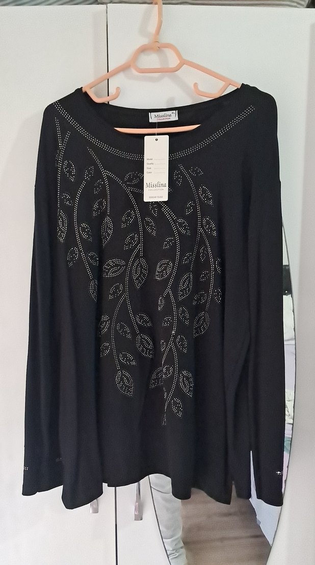 Siyah örgü bluz, uzun kollu ve yuvarlak yakalıdır. Yaprak desenli baskısı ve rahat kesimiyle günlük kullanıma uygundur.