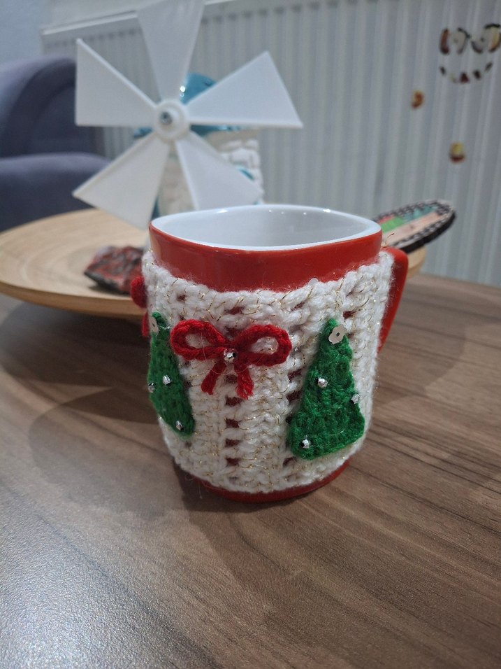 Yeşil yılbaşı ağaçları ve kırmızı fiyonklarla süslenmiş beyaz örgü kupa kılıfı. ☕