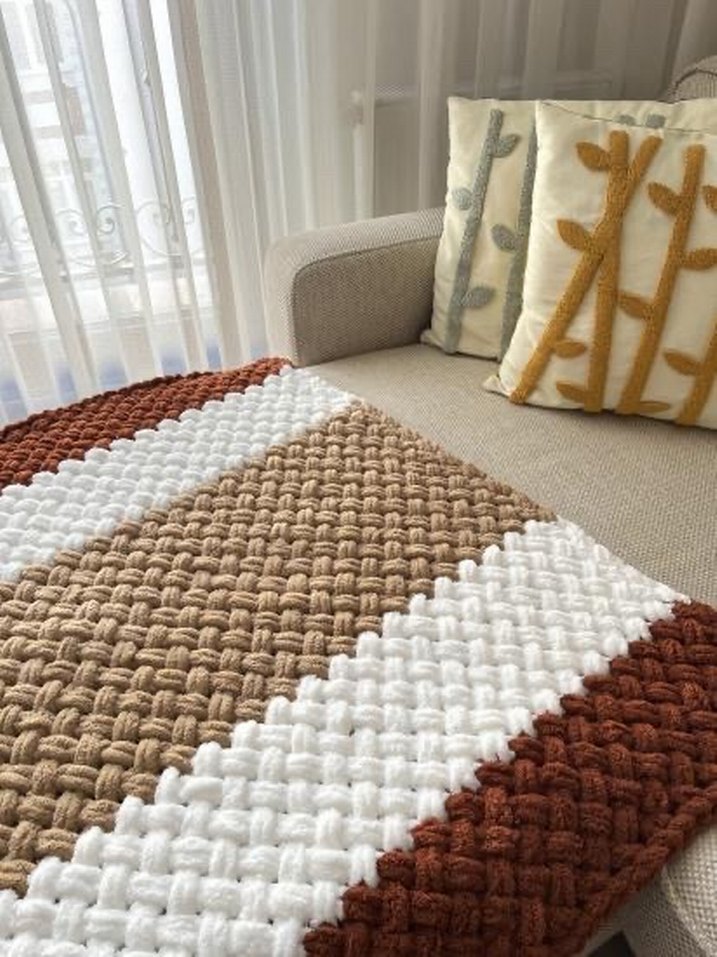 Örgü çocuk battaniyesi, yumuşak açık kahverengi ve beyaz çizgilerle sıcaklık ve konfor sağlar. istediğiniz boyutta istediğiniz renk yapılır ilan açmamı isteyiniz