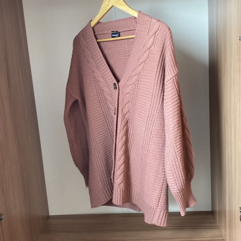 Örgü yapıda, V yaka ve uzun kollu, bol kesim midi uzunluğunda pastel bej kadın hırka, rahat ve sade tasarımla günlük kullanıma uygundur.
