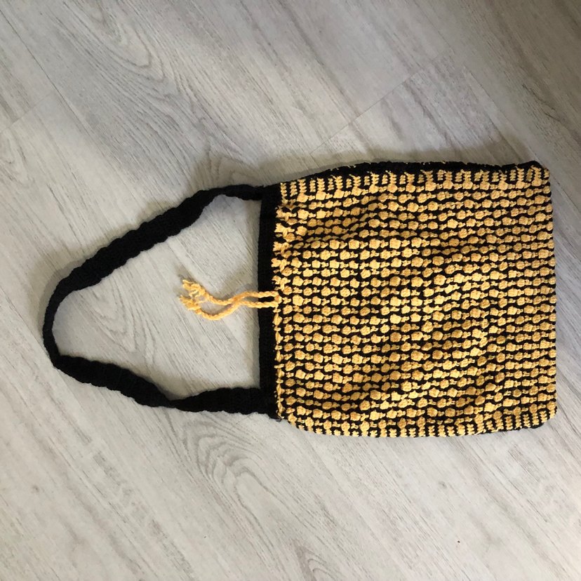 Koyu altın yılan desenli, örgü kadın çanta. Rahat bohem tarzıyla günlük kullanıma uygundur.