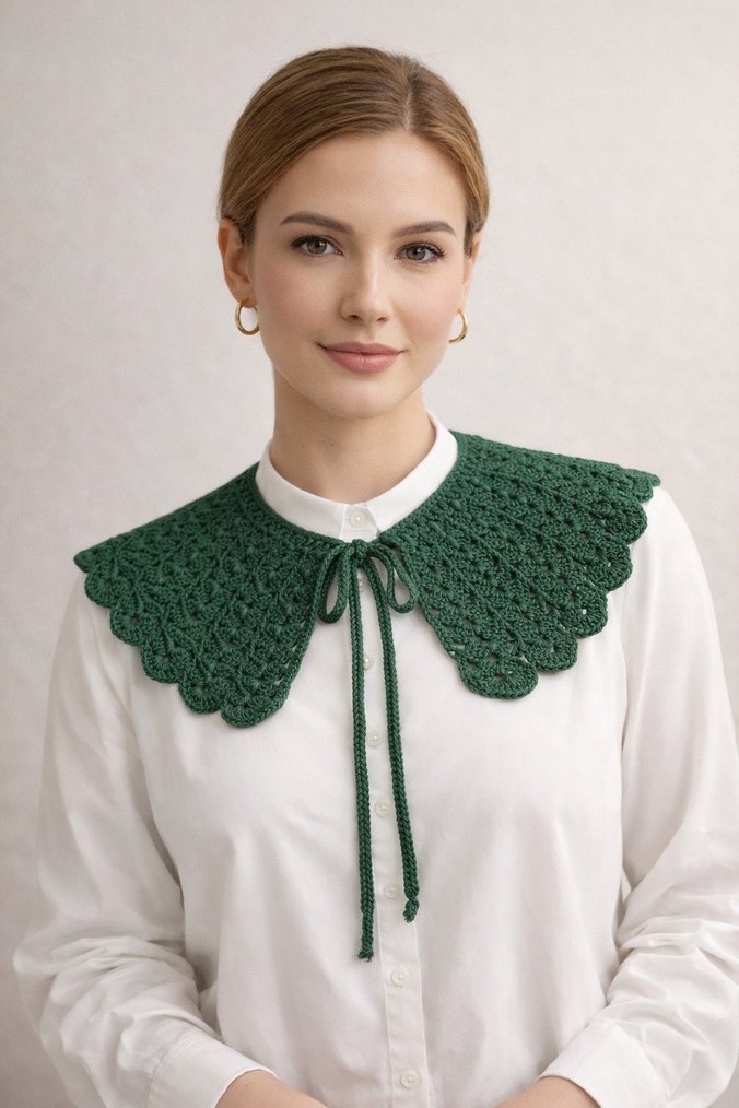 Klasik bohem tarzda, parlak yeşil dantel işlemeli kadın yaka. Normal midi uzunlukta, önde bağlamalı, günlük kullanıma şıklık katar. Koton iple örülmüştür.