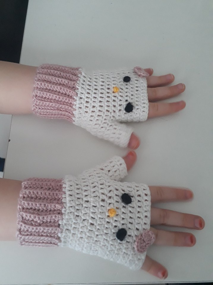 Beyaz ve pastel pembe renklerde, örgü yarım parmak çocuk eldivenleri, rahat ve bohem tarzda sevimli hayvan yüzü detayına sahiptir. Sokak modasına uygundur. sipariş alınir