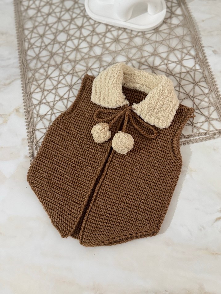 Kahverengi, örme dokulu, kolsuz kız çocuk yeleği, bol kesim ve ponponlu yumuşak yakaya sahiptir, bohem tarzda rahat bir görünüm sunar.