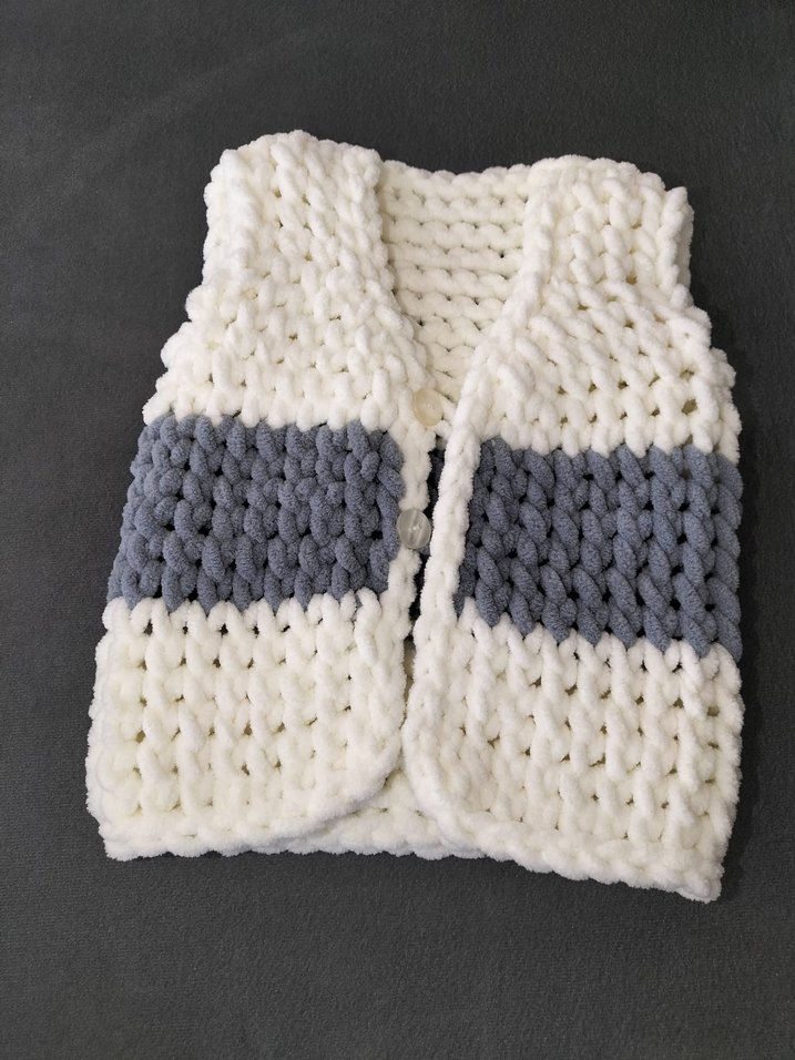 El örgüsü yelek.Beyaz ve gri renkte örülmüştür. Kolsuz ve sade tasarımlıdır.0-6 Ay için uygundur.İstediginiz ölçüde örülür.