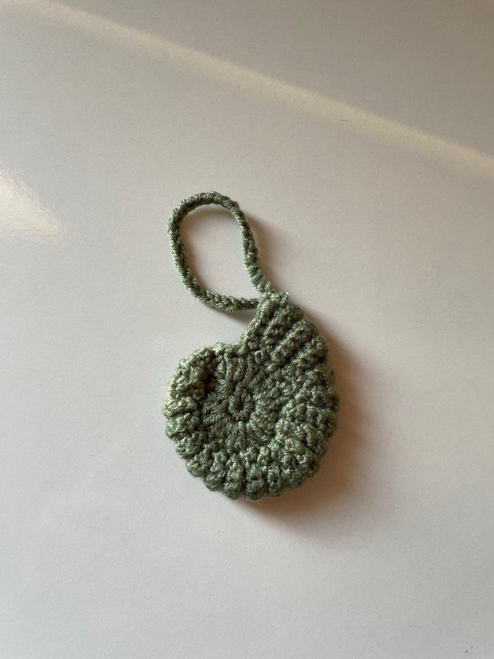 Yeşil örgü kadın çanta, yuvarlak formda ve bileğe takılabilen kayışlı, rahat bohem tarzı sunar.
