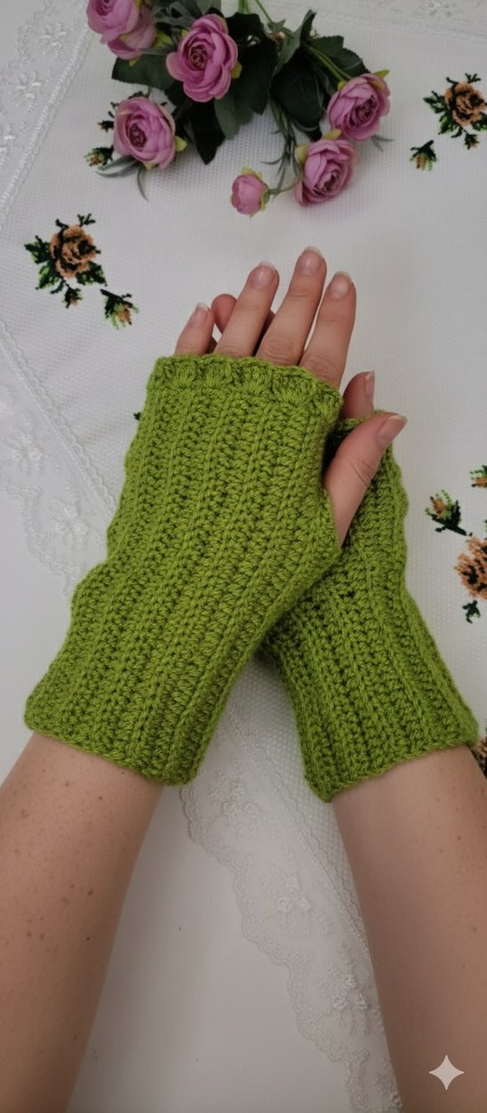 Yeşil renkli, örgü dokulu, bohem tarzda kadın kolluk . Renkli ve retro havasıyla rahat bir görünüm sunar. kendım yapıyorum ölçulerı mevcut gosel bakabilirsin marka temsili ❗️