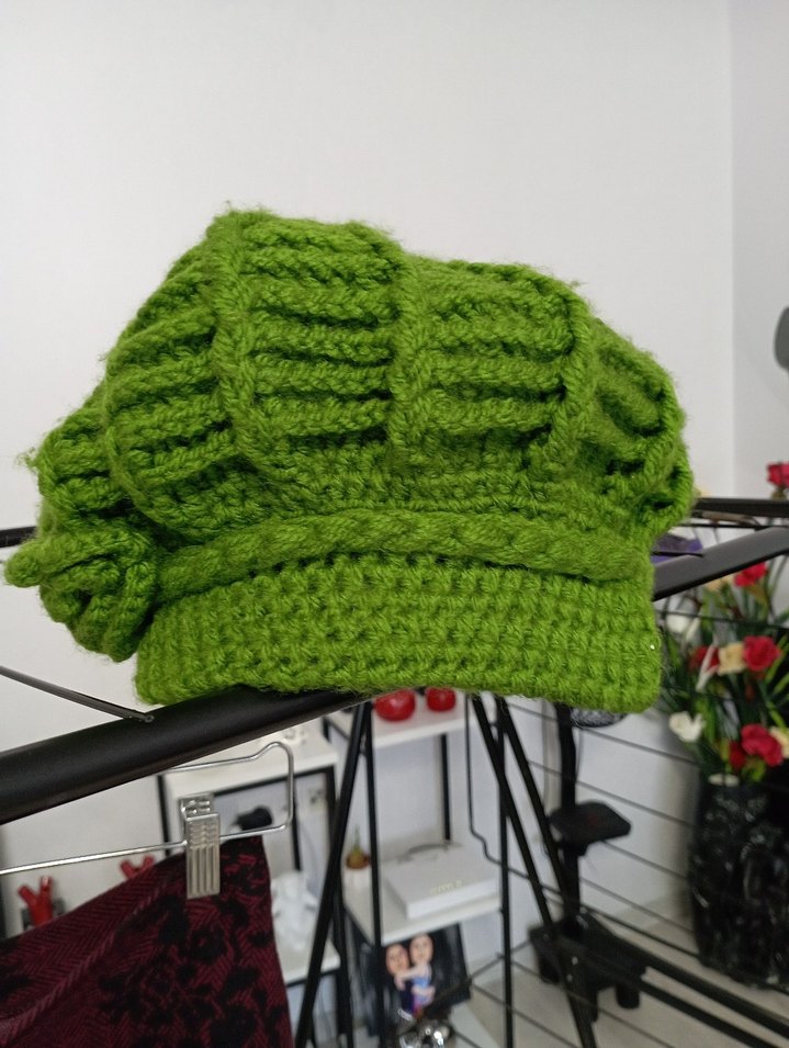 Renkli yeşil örgü kadın bere, rahat ve kalın dokusuyla sıcak tutar. Biker tarzı ve örgü deseni dikkat çeker. şalıda var.