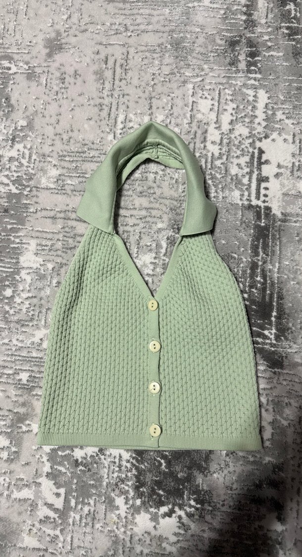 Örgü, yeşil renkli, yakalı ve düğmeli, kollu olmayan, midi boy kadın süveter yelek. Rahat ve salaş kesimiyle günlük kullanıma uygundur.
