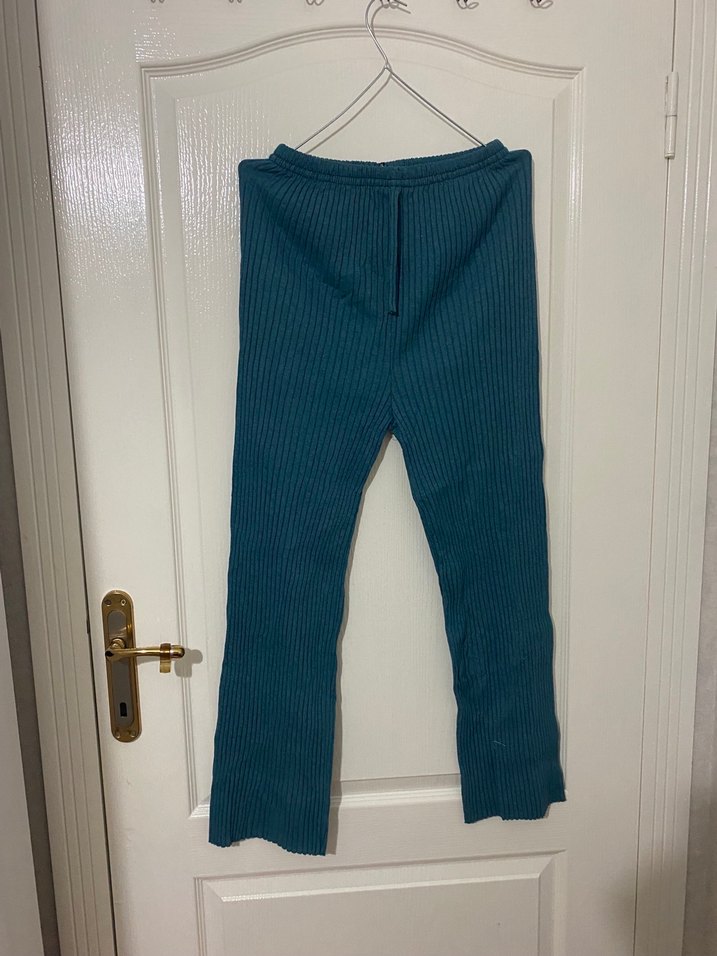 Örgü keten kumaştan yapılmış, yeşil renkli pantolon