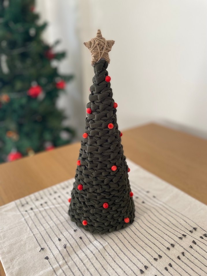 örgüden yapılmış yılbaşı ağacı süsü, üzerinde yıldız ve küçük kırmızı süslemeler bulunur.