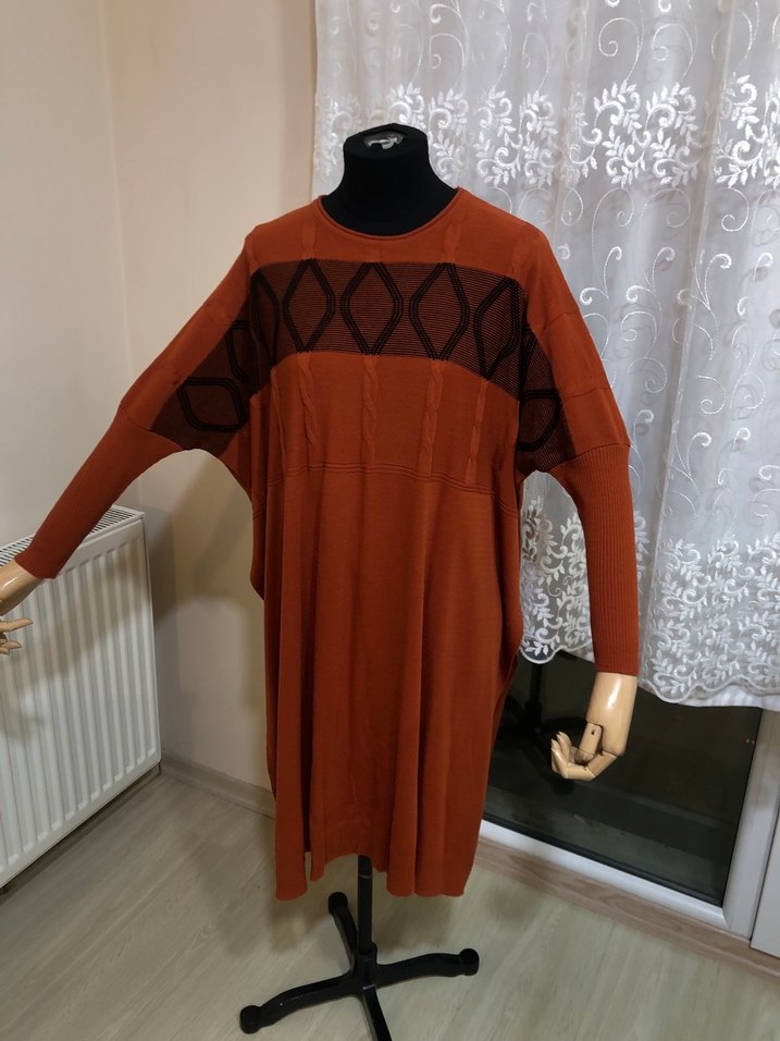 yuvarlak yaka ve uzun kolludur. Salaş kesim ve midi boydadır. Göğüs kısmında örgü detayları bulunur, günlük kullanıma uygundur. Uzunluk:90 En:82