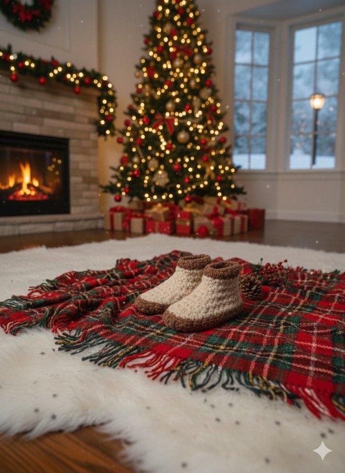 Örgü yünden yapılmış, açık kahverengi kareli desene sahip, klasik tarzda erkek çocuk ev terlikleri.