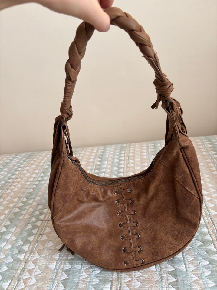 Örgülü sap ve tokalı detaylara sahip kahverengi deri kadın çanta, bohem tarzını yansıtıyor. Yumuşak deri malzemesiyle günlük kullanıma uygundur.
