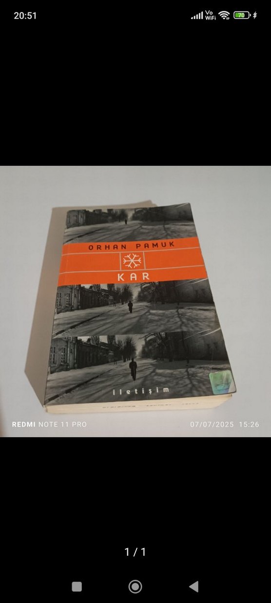 Orhan Pamuk'un Kar romanı, siyah-beyaz kapak üzerinde kırmızı bir şerit ve başlık ile İletişim yayınevi tarafından basılmıştır.