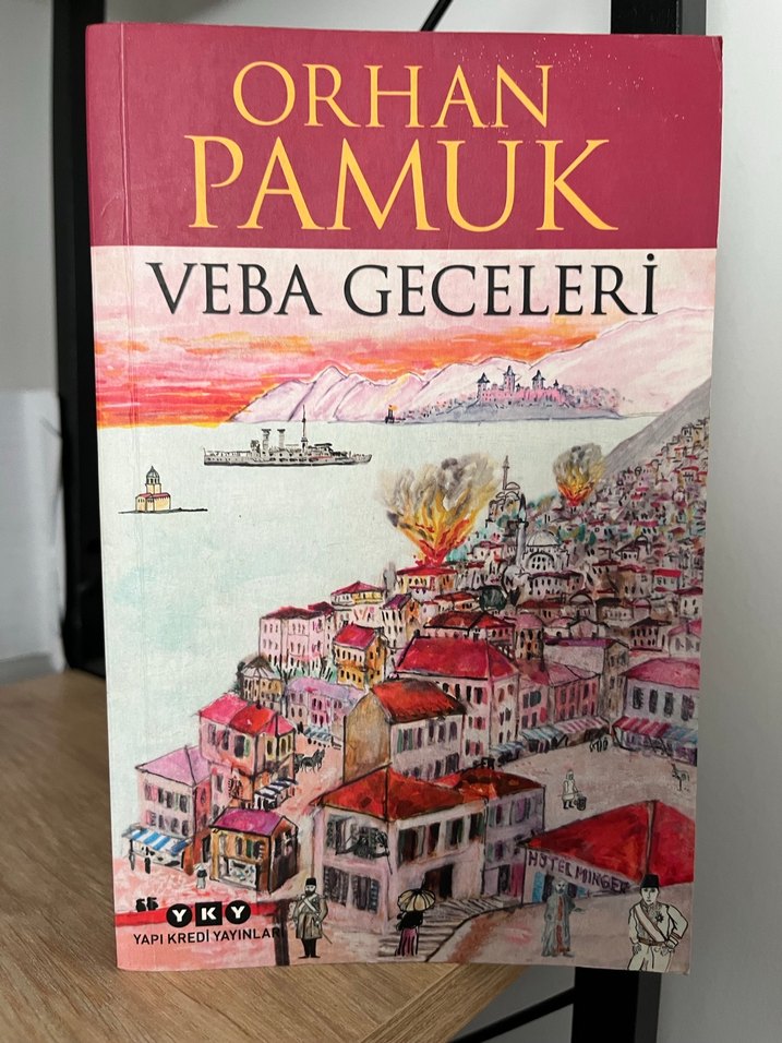 Orhan Pamuk'un Veba Geceleri romanı, yangınlı şehir manzarası ve gemi resmiyle Yapı Kredi Yayınları tarafından basılmıştır.