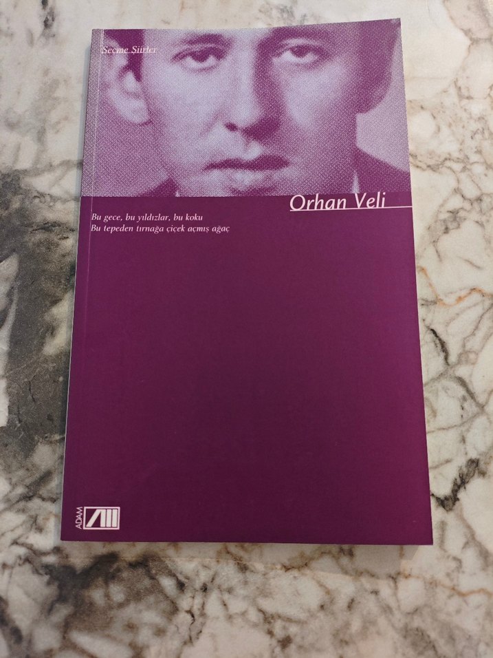 Orhan Veli'nin şiirlerinin yer aldığı, önünde portresi bulunan mor kapaklı şiir kitabı.
