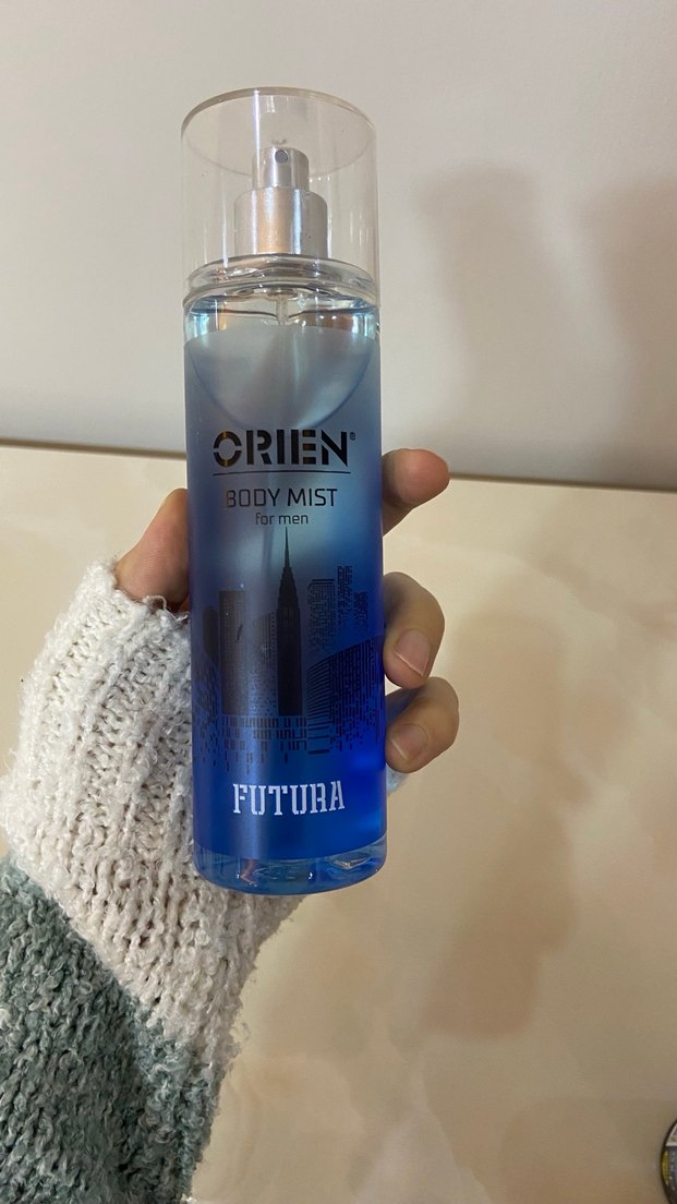 ORIEN FUTURA erkekler için vücut spreyi, şeffaf ve mavi tonlu şişede ferah ve hafif bir koku sunar. Günlük kullanım için uygundur.