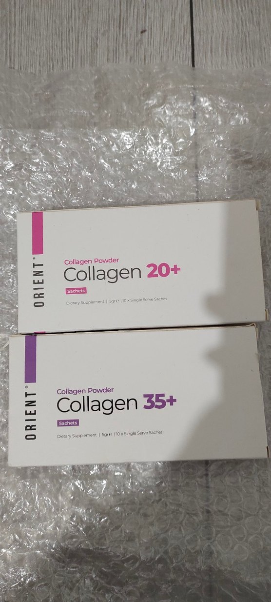 Orient markasına ait 20+ ve 35+ yaş için kolajen tozları, tek kullanımlık poşetlerde besin takviyesi olarak sunulmuştur.