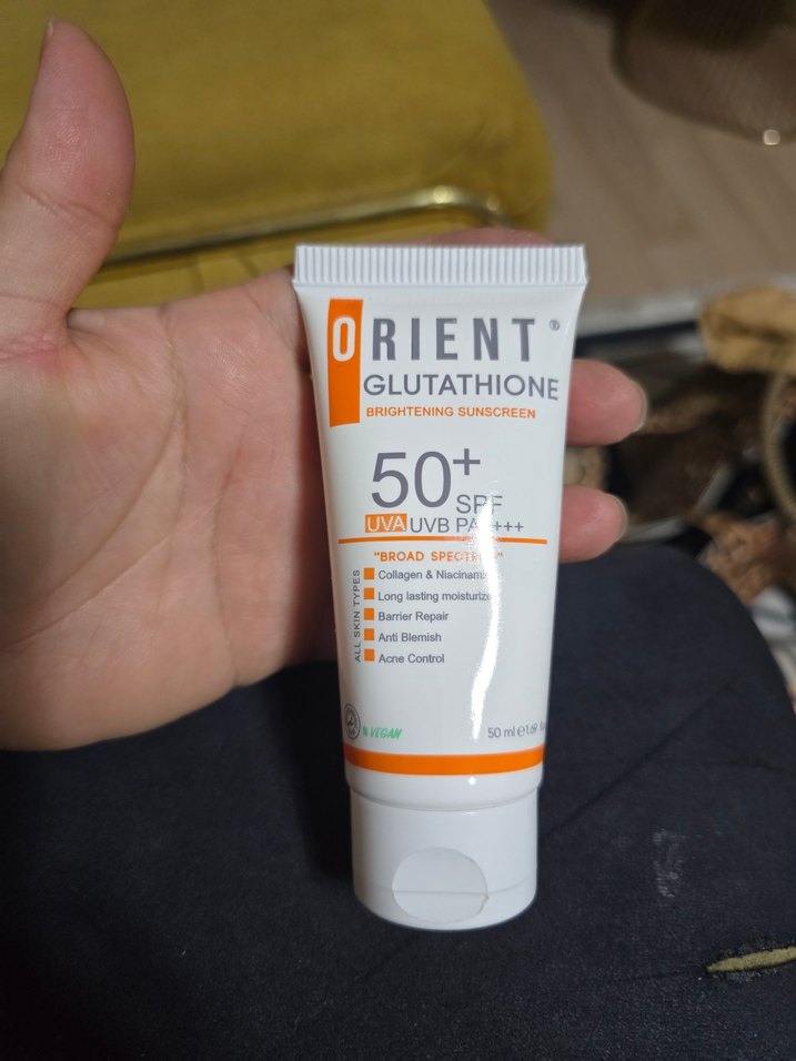 Orient Glutatyonlu aydınlatıcı güneş koruyucu, SPF 50+ geniş spektrum UVA ve UVB koruması sağlar. Kolajen ve niasinamid içerir, cildi nemlendirir, leke ve akne kontrolü yapar. Vegan, 50 ml.hiç kullanılmadı
