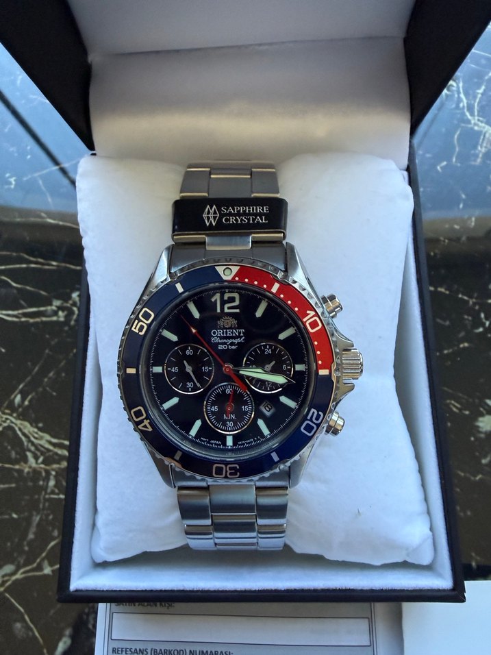 Ürün yetkili bayii Aslan saat çıkışlı olup sıfır hiç kullanılmamıştır 2 yıl garantilidir. Özellikleri safir cam çap 43mm kasa kalınlığı 13mm kordon genişliği 22mm güç rezerv 40 saat ağırlık 168 gram su geçirmezlik 200 m çelik kasa ve çelik kordon.Bilekte çok şık duran Orient Mako serisinin solar mekanizmada en çok tutulan modelidir tam bir fiyat performans saati alana hayırlı olsun.
