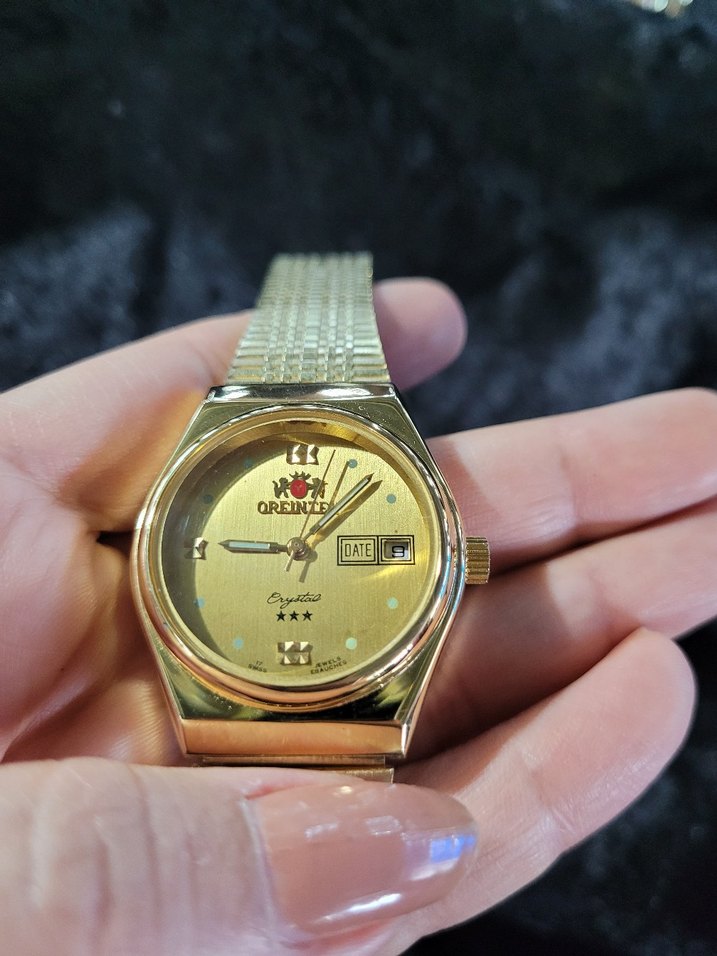Orientex altın kaplama, siyah kadran, tek pencere takvim göstergeli kurmalı kol saati Kullanılmamış yepyeni kurmalı saat. Farkli kadran renk secenekleri mevcuttur. Pratik kullanımda veya ayar yaparken 24 saat çevirince takvimi değişir. ⌚