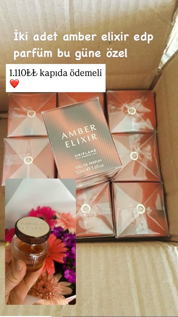 Oriflame Amber Elixir Eau de Parfum kadın parfümü, 50 ml şişede. Sıcak amber notaları içerir. İki adet 1.110 TL kapıda ödemeli.