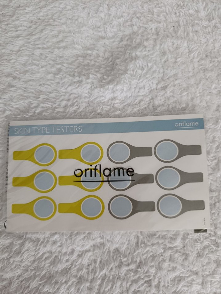 Oriflame markalı, bej ve gri renkte cilt tipi test cihazları. Cilt tipini doğru belirlemek için kullanılır.