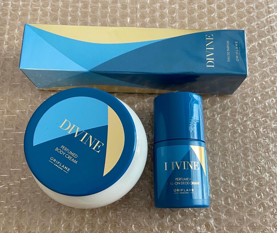 Oriflame Divine parfüm:Divine parfümlü vücut kremi ve roll-on deodorant seti, ferah koku ve bakım sağlar.