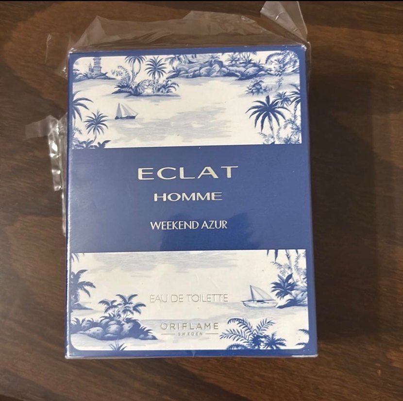 Oriflame Eclat Homme Weekend Azur Eau de Toilette, deniz esintisiyle ferah ve zarif bir koku sunar. Mavi-beyaz palmiyeli ve yelkenli desenli ambalajıyla dikkat çeker. Jelatini bozuldu ancak kullanılmadı. 75 ml. Odunsu bir koku