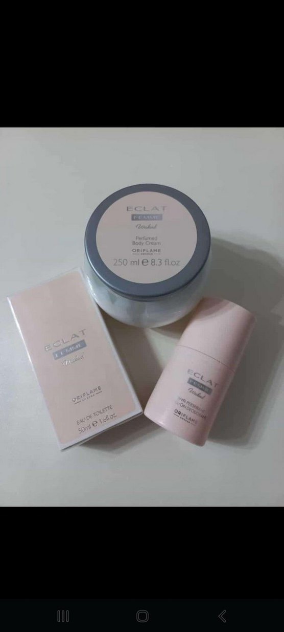 Oriflame Eclatwekend parfüm 250 ml parfümlü vücut kremi ve deodorant bulunmaktadır. Ürünler yumuşak, zarif bir kokuya sahiptir.
