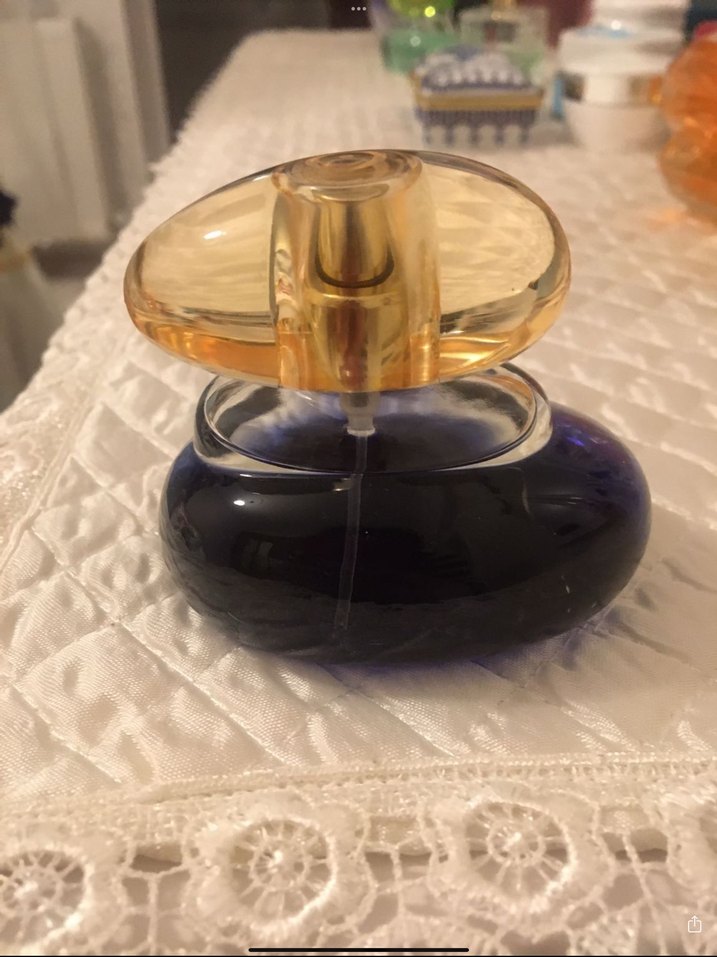 Koyu mavi tabanlı ve şeffaf amber kapaklı kadın parfümü şişesi, zarif koku saklama için tasarlanmıştır. 1-2 kere kokusuns bakılmak için kullanılmıştır