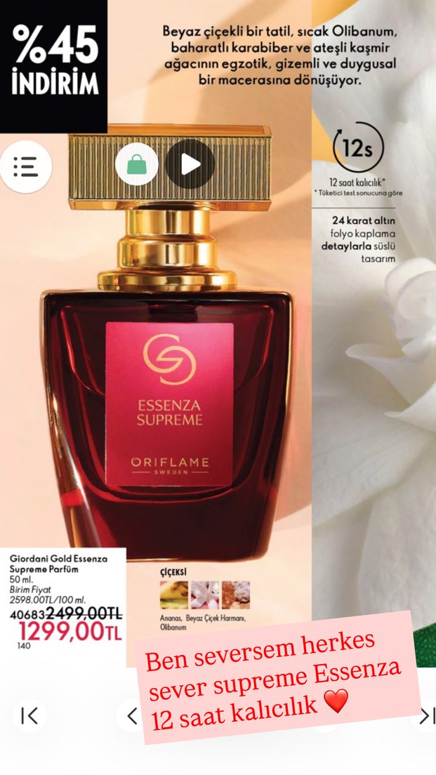 Oriflame Essenza Supreme kadın parfümü, 24 karat altın folyokaplama detayları ve ananas, beyaz çiçek harmanı ile çiçeksi kokusu sunar. 12 saate kadar kalıcıdır.