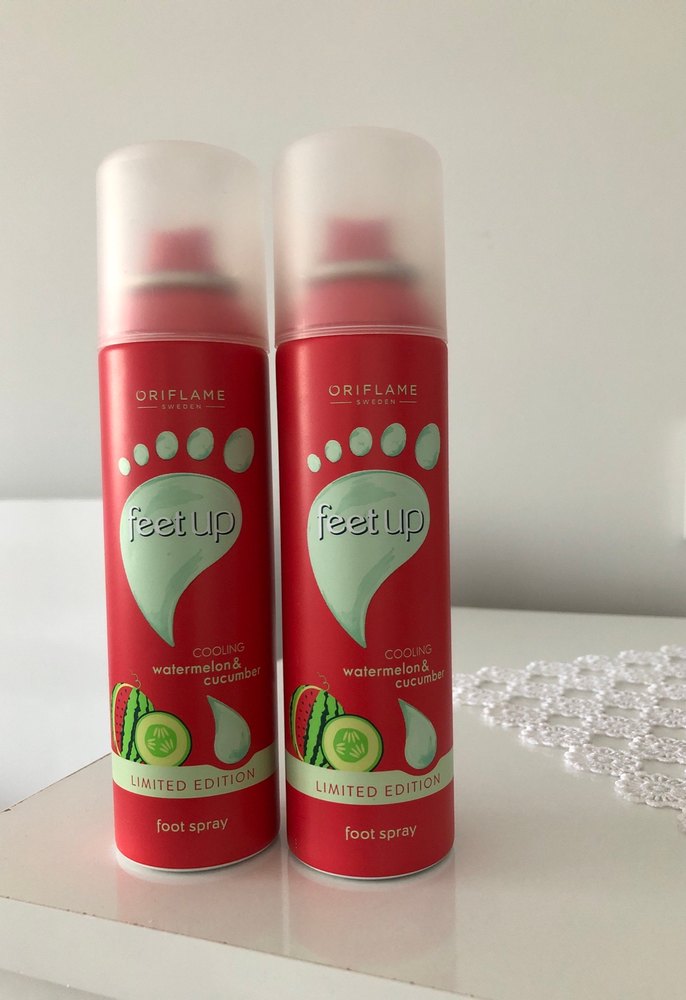 Oriflame Feet Up ayak spreyi, karpuz ve salatalık kokusuyla serinletici etki sağlar. Sınırlı sayıda üretilmiş, ayakları ferahlatır ve koku giderir.