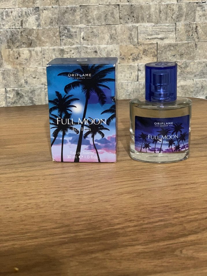 Oriflame Full Moon erkek parfümü, 30 ml şişede, koyu mavi kapak ve tropikal tasarımla, ferahlatıcı koku sunar.