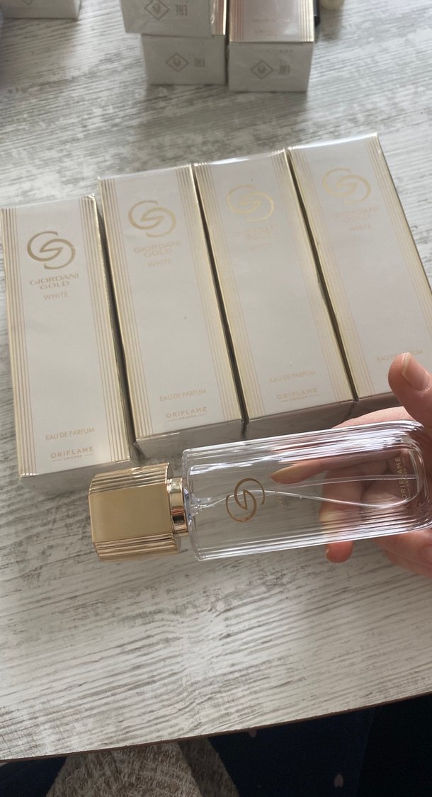 Oriflame Giordani Gold White kadın parfümü, şık ambalajda, altın kapaklı şeffaf şişede. Eau de Parfum formülüyle.