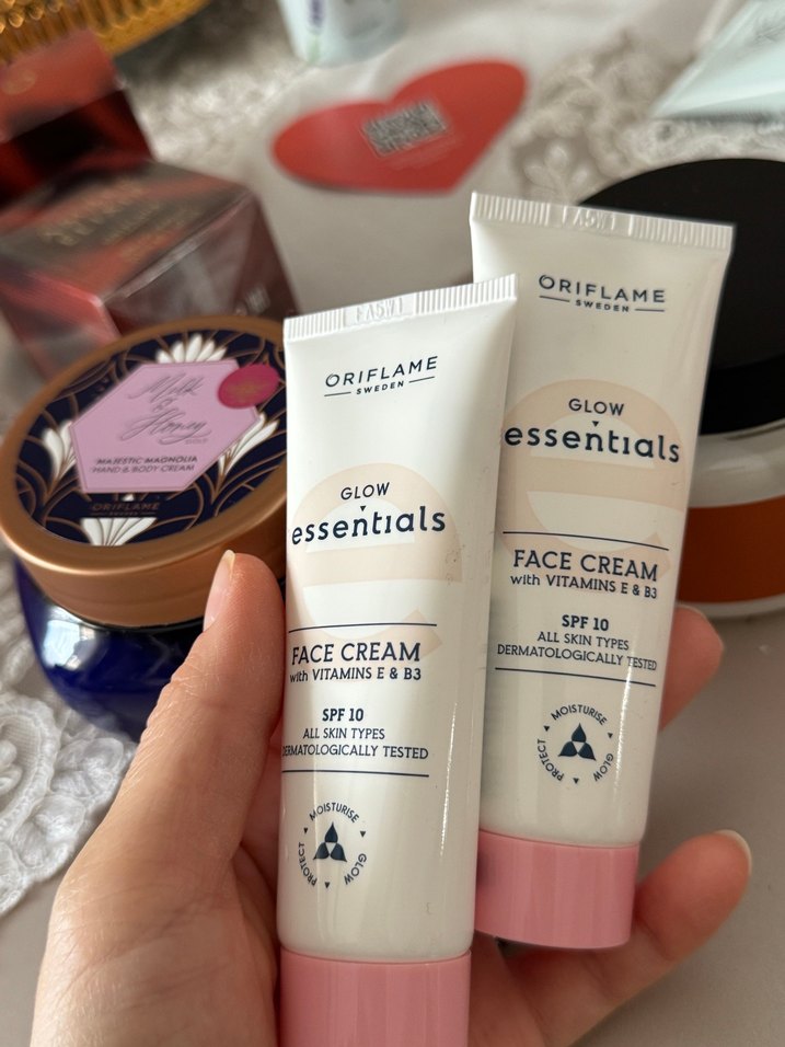 Oriflame Glow Essentials SPF 10 içeren, E ve B3 vitaminli yüz kremi. Tüm cilt tipleri için uygun, dermatolojik olarak test edilmiştir.