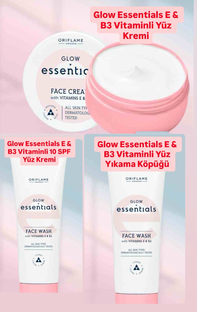 3 adet fiyatıdır Oriflame Glow Essentials yüz yıkama ve yüz kremleri, E ve B3 vitaminleri içerir. Tüm cilt tiplerine uygun ve dermatolojik olarak test edilmiştir. Cildi nemlendirmek, korumak ve ışıltılı bir cilt sağlamak için tasarlanmış yüz kremidir. Cilt tonunu ve antioksidan E vitaminini eşitlemeye yardımcı olan B3 vitamini ile formüle edilmiştir. Cildi anında ve 24 saate kadar nemlendirirCildin gözle görülür şekilde daha parlak görünmesine yardımcı olurHafif, yağlı olmayan doku