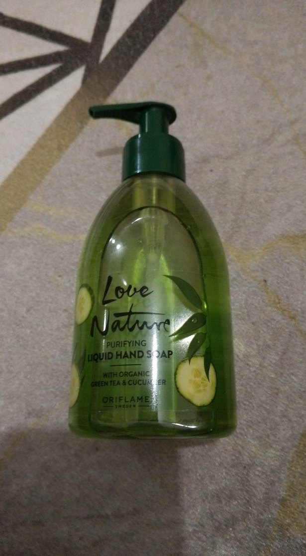 Organik yeşil çay ve salatalık özleri içeren Oriflame Love Nature arındırıcı sıvı el sabunu, elleri nazikçe temizler ve ferahlatır.