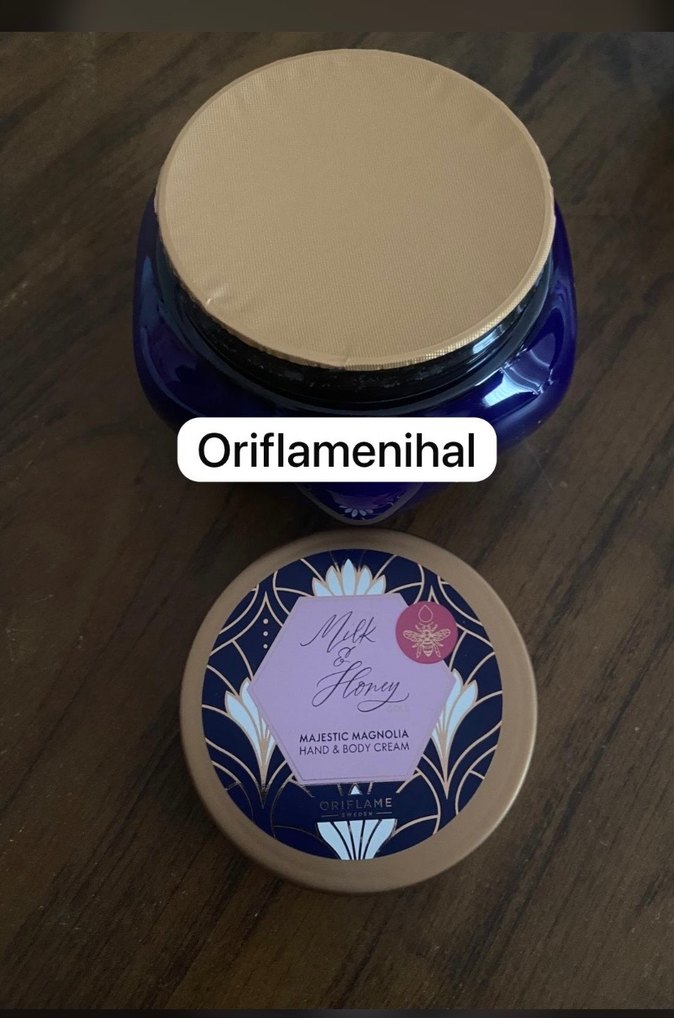 Oriflame Majestic Magnolia el ve vücut kremi, zengin mavi kavanozda altın kapaklı, besleyici ve çiçeksi kokulu krem.