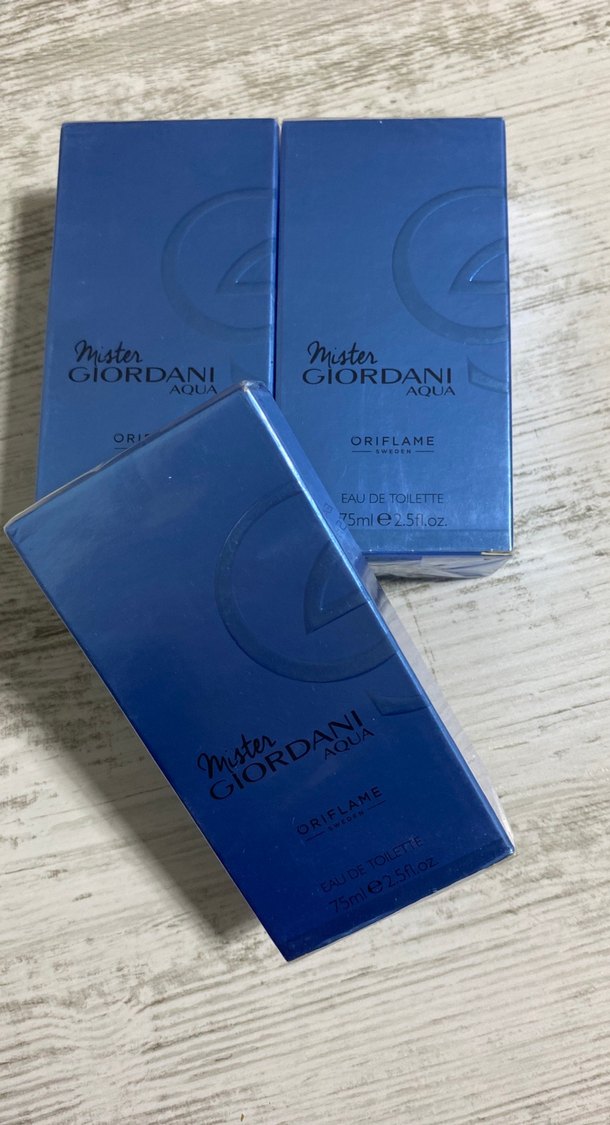 Oriflame Mister Giordani Aqua erkek parfümü, 75 ml şişede koyu lacivert tasarımla sunulur. Çağdaş Paris tarzı eau de toilette kokusuna sahiptir. 3 adet