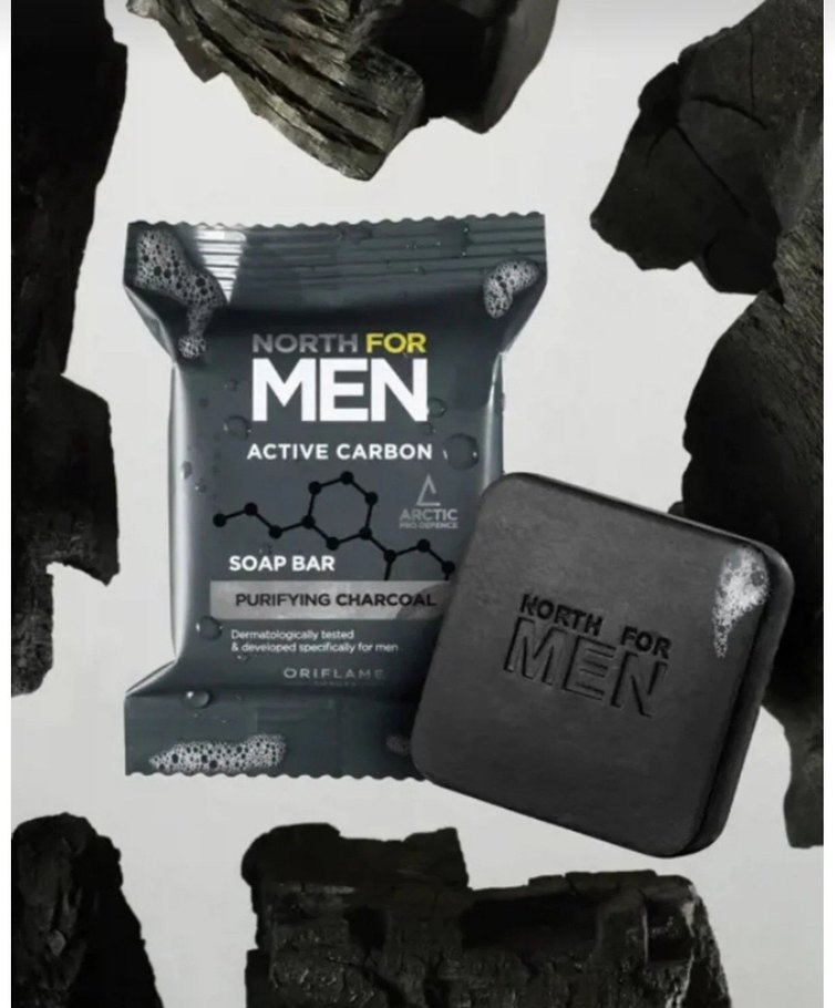 Oriflame North For Men Aktif Karbon sabun çubuğu, arındırıcı kömür içerir ve erkekler için özel olarak geliştirilmiştir.
