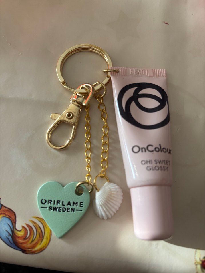 Oriflame OnColour pastel altın renkli, parlak bitişli dudak parlatıcısı, kalp ve deniz kabuğu figürlü anahtarlıkla birlikte.